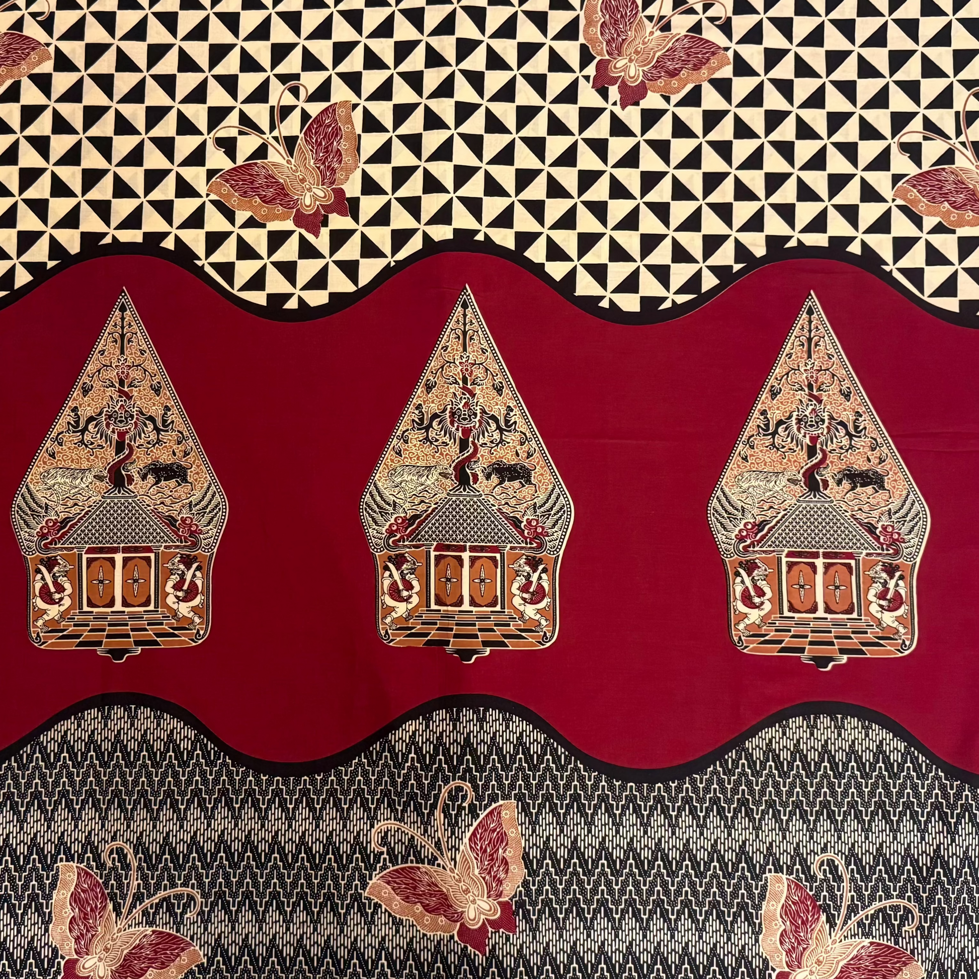 Dive into the rich cultural tapestry of Indonesia with our exquisite Batik featuring the iconic Wayang Gunungan design. Traditionally symbolizing the spiritual and physical realms, the Wayang Gunungan is a central element in Javanese shadow puppetry, representing the universe and the connection between the earthly and divine.